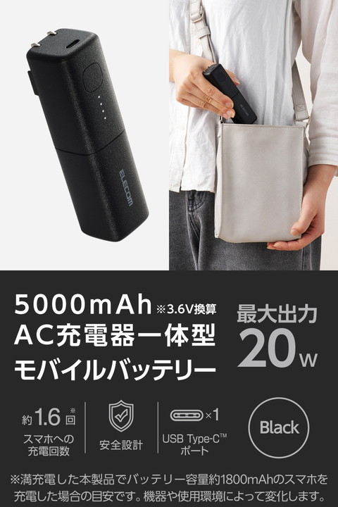 エレコム モバイルバッテリー AC充電器 一体型 5000mAh 小型 USB-C 出力×1 タイプC type-c リチウムイオン電池 おまかせ充電 USB パワーデリバリー 高速充電 20W PSE適合 ブラック┃EC-C18LBK
