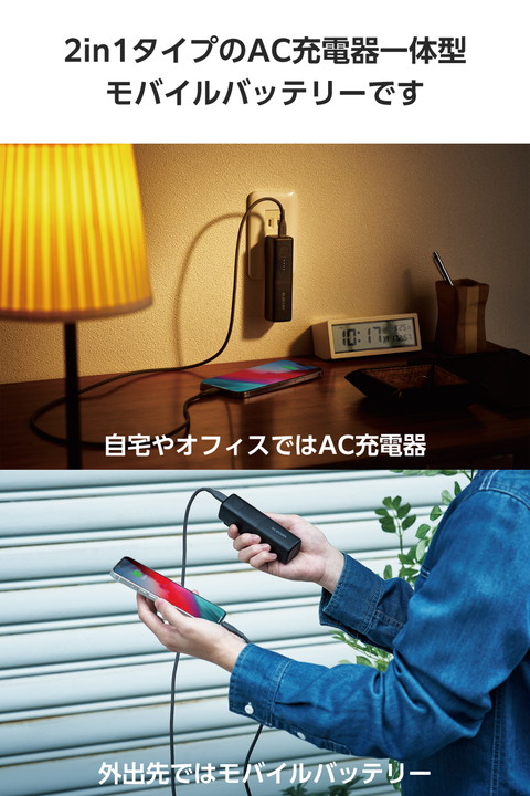 モバイルバッテリーとAC充電器の1台2役!スティックタイプで持ち運びに便利な5000mAhのAC充電器一体型モバイルバッテリーです。USB Power Delivery 20W対応でスマートフォンを高速充電できます。