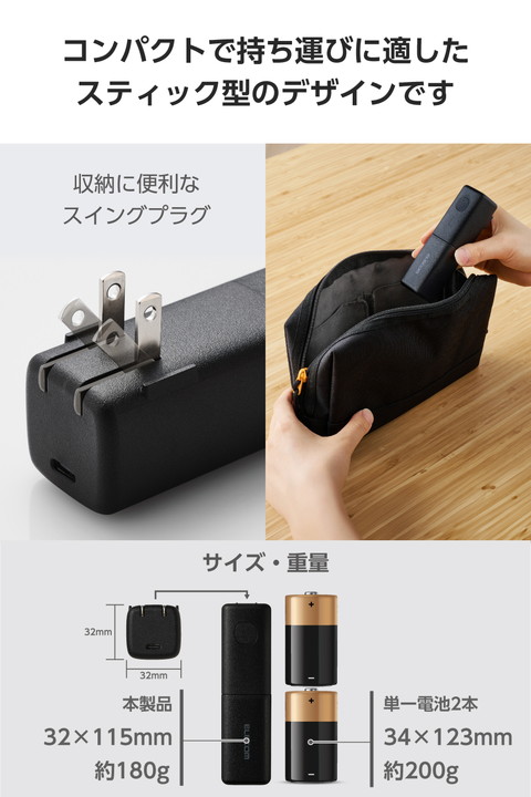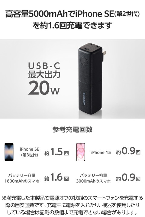 モバイルバッテリーとAC充電器の1台2役!スティックタイプで持ち運びに便利な5000mAhのAC充電器一体型モバイルバッテリーです。USB Power Delivery 20W対応でスマートフォンを高速充電できます。![]() ■1台2役で使えるAC充電器一体型モバイルバッテリーです。 ■小さなバッグやポーチにすっぽり収まるスティックタイプ。かさばらないので持ち運びに便利です。 ■USB Power Delivery 20Wに対応。スマートフォンを高速充電できるため、外出先での急な充電切れの際も安心です。 ■本製品(バッテリー容量5000mAh)で、1800mAhのスマートフォンを約1.6回、3000mAhのスマートフォンを約0.9回充電可能です。 ■※満充電した本製品で電源オフの状態のスマートフォンを充電する際の目安回数です。充電中に電源を入れたり、機器を使用したりしている場合は記載の数値まで充電できない場合があります。 ■本製品をコンセントに挿した状態でスマートフォンを接続することで、AC充電器としても使えます。 ■本製品とスマートフォンを同時に接続することでまとめて充電できる“まとめて充電”に対応しています。 ■※スマートフォンへ優先的に充電されます。スマートフォンの充電が完了すると本製品に充電されます。 ■コンセントに挿すだけで本製品を直接充電可能。本製品は約2時間30分で充電できます。 ■※本製品のみを充電した場合の目安時間です。 ■電源プラグ部分にはスイングプラグ機構を採用。回転させて本体に収納できるためスマートに持ち運べます。 ■電池残量は4段階のLEDランプ点灯で確認できます。 ■約500回繰り返し使用可能な充電式リチウムイオン電池を搭載しています。 ■内蔵の充電式リチウムイオン電池は、JIS C8711およびJIS C8712(JIS C8714の内容を含む)に準拠した安全設計です。 ■日本の電気用品安全法(PSE)の技術基準に適合した安全性の高い商品です。 ■過充電・過放電・過電流防止機能および短絡保護機能と温度検知機能の5つの保護機能を備えた安心の回路設計です。 ■電池容量が160Wh(43,243mAh)以下であるため、機内持ち込みも可能です。 ※航空会社の規定によって例外がある場合があります。 ■※工場出荷時に70%程度充電されています。充電式リチウムイオン電池は時間とともに放電するので、ご使用になる前に充電することを推奨します。 ■※ケーブルを挿したままにするとバッテリーの残量が減ってしまいます。使用しない場合は必ずケーブルを外してください。 ■※本製品とスマートフォンを接続するケーブルは付属していません。 ■※USB Type-C and USB-C are trademarks of USB Implementers Forum. ■本製品は、一般社団法人JBRCの回収対象製品であり、回収協力自治体や協力店(家電量販店・ホームセンターなど)で回収が可能です。 ■※JBRCのホームページでお住まいの地域の回収協力自治体・協力店をご確認ください。 ■自社環境認定基準を1つ以上満たし、『THINK ECOLOGY』マークを表示した製品です。 ■環境保全に取り組み、製品の包装容器におけるプラスチック重量を、社内基準製品より20%以上削減した製品です。 ■環境保全に取り組み、製品の包装容器が紙・ダンボール・ポリ袋のみで構成されている製品です。 ![]() ■対応機種:iPhoneおよびUSB端子で充電するスマートフォン、タブレット、他小型電子機器 ■定格入力電圧:AC:100V-240V 50Hz/60Hz ■定格入力電流:AC:1.5A ■コネクター形状(電源出力側):USB Type-C(TM)ポート×1 ■定格出力電圧:5V/9V ■定格出力電流:最大出力20W AC充電器として使用時・バッテリーとして使用時いずれも3A/2.22A ■電池種類:充電式リチウムイオン電池 ■電池定格容量:3.6V/5000mAh 18.0Wh ■充電時間:約2時間30分 ※製品本体のみを充電した場合の目安です。スマートフォンなどのモバイル機器を接続した場合は記載の時間では充電できません。 ■外形寸法:幅約32mm×奥行約32mm×高さ約115mm ■重量:約180g ■カラー:ブラック ■くり返し使用回数:500回 ■環境配慮事項:使用温度:0℃〜40℃ ■電気用品安全法:○PSE 特定以外の電気用品 ◇PSE 特定電気用品 ■保証期間:1年間 ■その他:Lightningポート搭載の端末で使用する場合は別途Lightningプラグのケーブルをご用意ください。 |