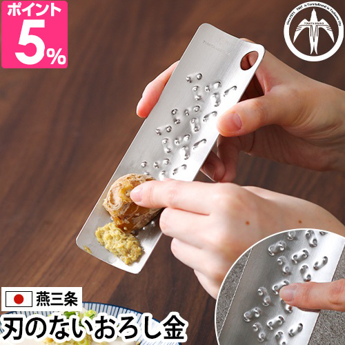 燕三条発!50年以上の歴史を持つ金属加工会社トミタが作る、刃を使わない「トミタ式おろし金2」。刃がないからすりおろしのときに手を切らず安心、安全。にんにくなど小さな食材も最後まで擦り切れて、目詰まりをとるスクレーパーも必要ありません。洗う時のスポンジも引っかからずお手入れ簡単♪仕上がりはふわふわ食感。おろしたての香りと味わいを気軽に楽しめます。