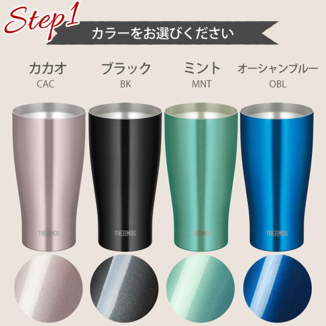 大容量のステンレス製魔法びん構造のタンブラーは4色から、お名前の背景は8種類からお選びいただけます。