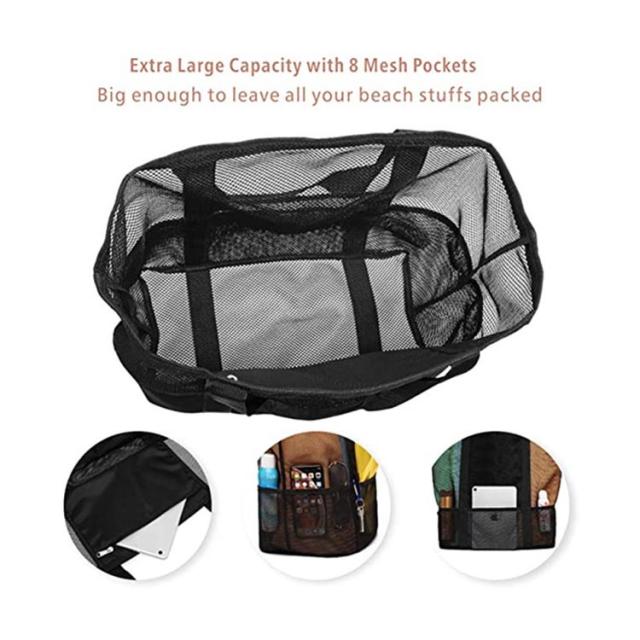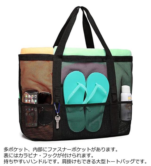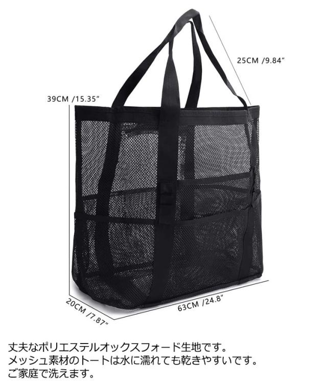 | 大容量のメッシュトートバッグです。砂場や海水浴、プール、温泉、ダイビングやお買い物、玩具入れに大活躍!通勤通学、ジム、旅行など荷物が多い時に便利なバッグです。 多ポケット、内部にファスナーポケットがあります。表にはカラビナ・フックが付けられます。持ちやすいハンドルです。肩掛けもできる大型トートバッグです。 大き目ですが軽量でコンパクトに折り畳みできるトートので旅行や海など外出用に携帯できます。 網目なので砂や水が底に溜まりません。内部のビニールポケットはファスナー付なので小物を収納できます。※生活防水仕様です、完全防水ではありません※ 丈夫なポリエステルオックスフォード生地です。メッシュ素材のトートは水に濡れても乾きやすいです。ご家庭で洗えます。 | |