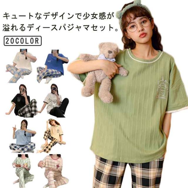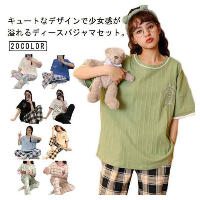 パジャマ 綿混 セットアップ レディース 寝間着 肌に優しい ルームウェア 夏 ポッケト ワンマイルウェア 部屋着 ロング 寝巻き 半袖 tシャツ 2点セット 五分袖 ルームウェア 半袖tシャツ コットン混 5分袖 ラウンドネック 丸首 パンツ チェック 柄 可愛い おしゃれ