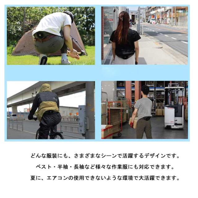 | 気流を生む立体構造の2つのファンが、背中、脇、お腹への広範囲送風を実現したウエストポーチファン。 風量は暑さに応じてお好みで3段階調節でき、夏の暑い日差しの下でも、ひんやり冷たい風が身体を冷やします。 ポリエステル素材で作られており、耐久性があり、軽量で長時間使用できます。 ファンから吹き出された空気が体と服の間を流れ、とても涼しくて気持ちいいです。 服の中に外気を取り入れ、体の表面に大量の風を流すことにより、汗を気化させて、涼しく快適にすごします。 どんな服装にも、さまざまなシーンで活躍するデザインです。ベスト・半袖・長袖など様々な作業服にも対応できます。夏に、エアコンの使用できないような環境で大活躍できます。 | |