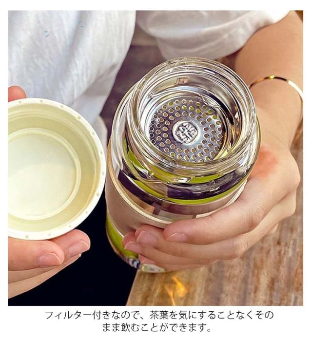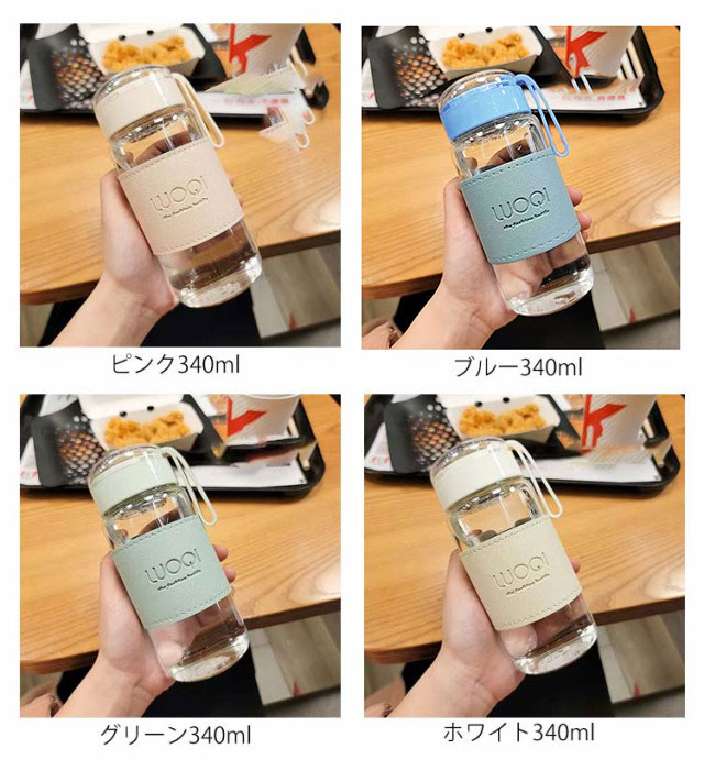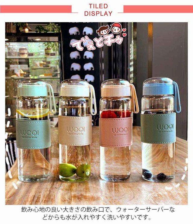 | 断熱カバー&フィルター付きのウォーターボトル。 飲み心地の良い大きさの飲み口で、ウォーターサーバーなどからも水が入れやすく洗いやすいです。 蓋は簡単に開く仕様なので散歩や通勤中など、いつでも手間を取らず快適に水分補給ができます。 PU製のカバーがついているため、断熱効果が期待できます。 シリコン製の紐がついているため、持ち運びにも便利です。 透明性・耐熱性のあるガラス製で、丈夫で軽く、お好みの水出し茶を作り持ち運びできます。 フィルター付きなので、茶葉を気にすることなくそのまま飲むことができます。 ドリンクを持ち運ぶだけじゃなく、いろんな便利な使い方ができるアイテムなので、アウトドアシーンやスポーツシーンをより楽しませてくれます。 シンプルなデザインながら落ち着いたくすみカラーがおしゃれで、毎日使いたくなります。 | |