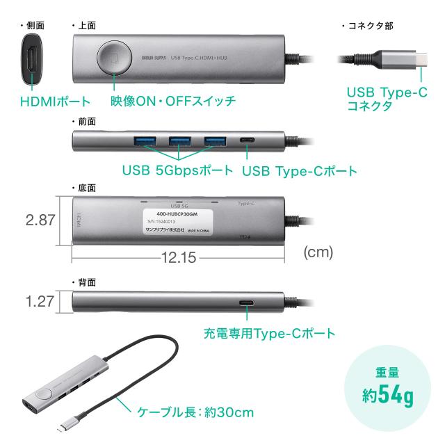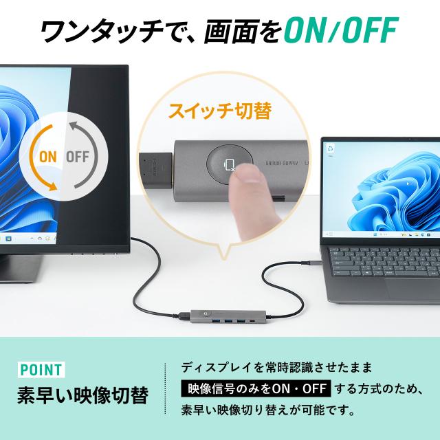 ドッキングステーション USB Type-C 画面ON/OFFスイッチ付き HDMI 4K/60Hz USB PD100W対応 USB 5Gbps ケーブル一体型 モバイル 持ち運び[400-HUBCP30GM]
