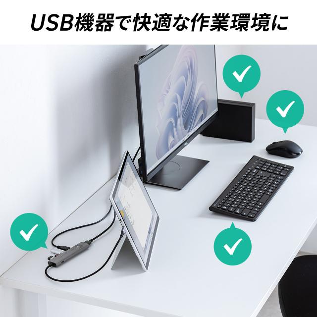 ●HDMIのON・OFFスイッチ付きの便利なモバイルドッキングステーションです。●USB 5Gbps(3.2 Gen1)、USB A×3ポート、Type-C×1ポート付で周辺機器が接続できます。
