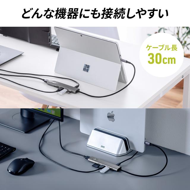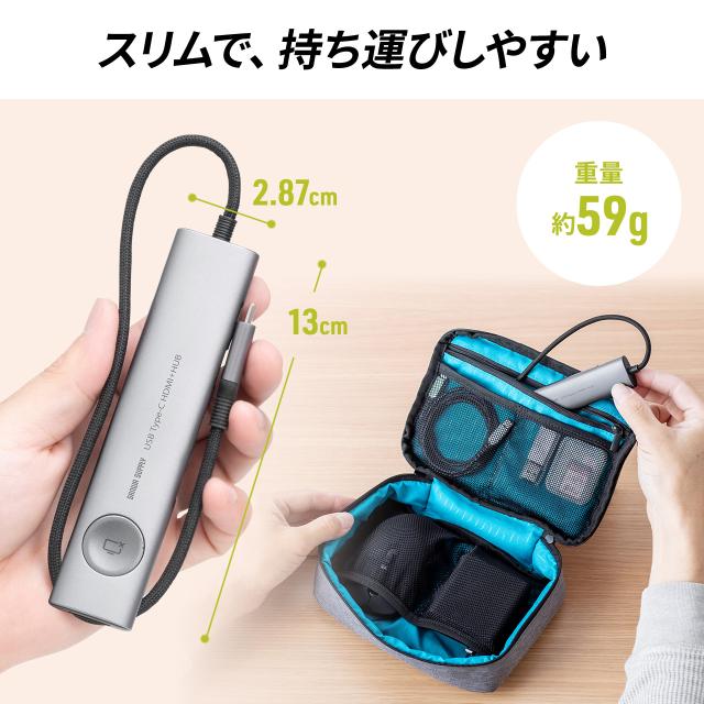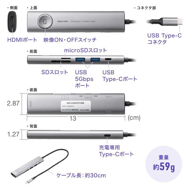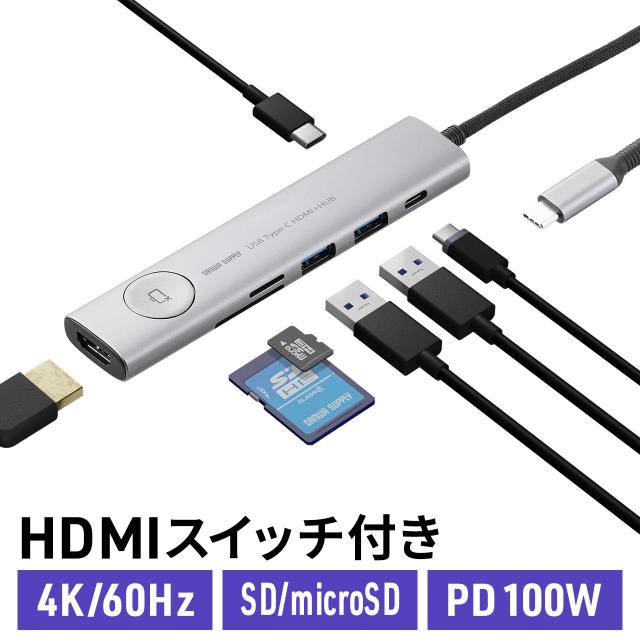 ドッキングステーション USB Type-C 画面ON/OFFスイッチ付き HDMI 4K/60Hz USB PD100W対応 USB 5Gbps カードリーダー ケーブル一体型 モバイル 持ち運び[400-HUBCP31GM]