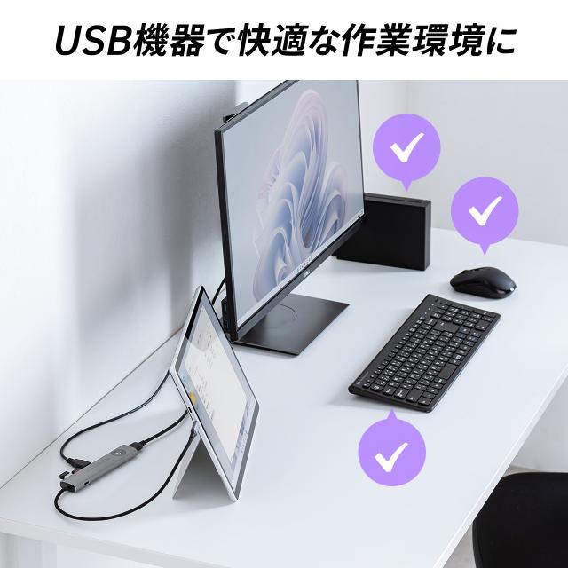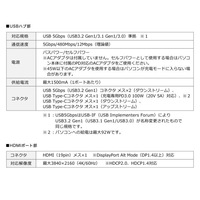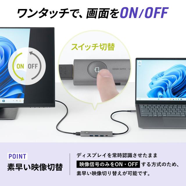 ●HDMIのON・OFFスイッチ付の便利なUSBハブです。●USB 5Gbps(3.2 Gen1) USB A×2ポート、Type-C×1ポート付で周辺機器が接続できます。