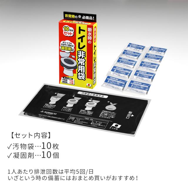断水時の洋式トイレなどに設置できる非常用袋と凝固剤が10セット入っております。