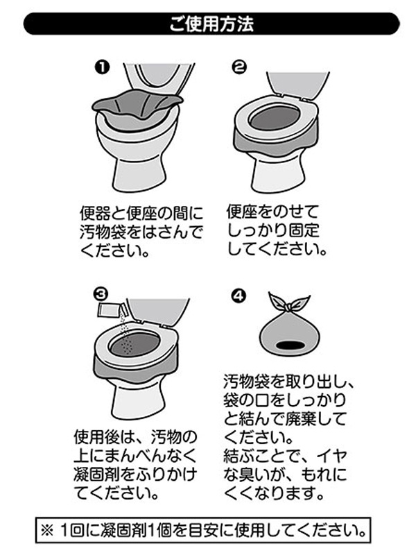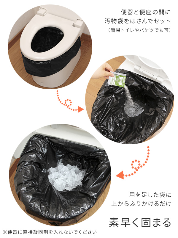 ご注意大便・小便にもご使用できますが、凝固剤は水分を固めるものであり、大便を固めることはできません。