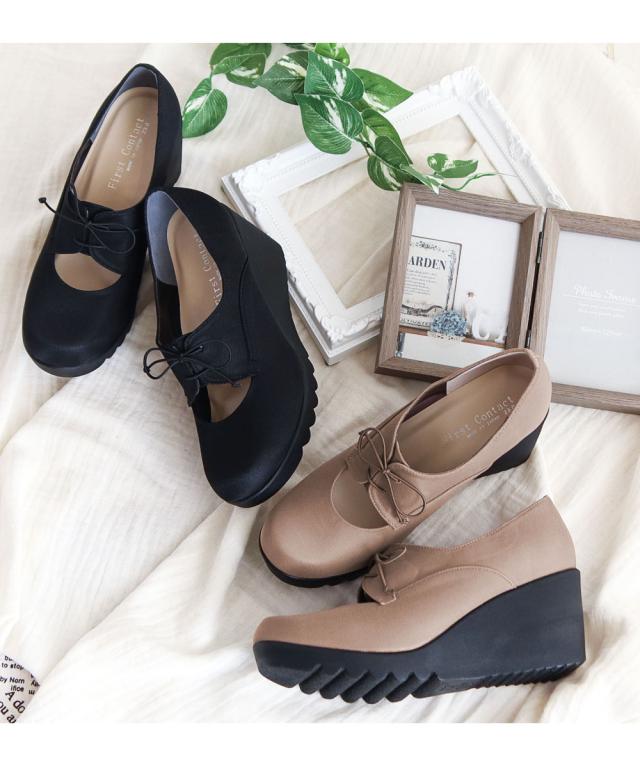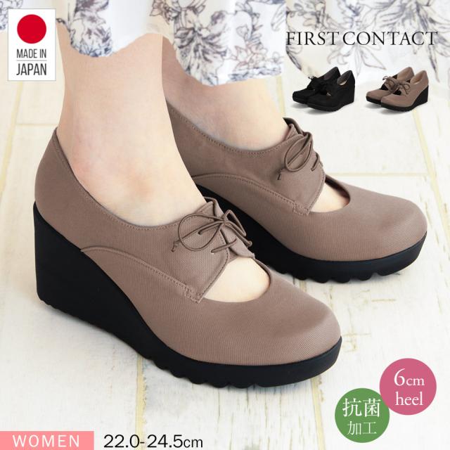 パンプス レディース 歩きやすい 撥水加工 晴雨兼用 抗菌 通気性 日本製 小さいサイズ 大きいサイズ ウェッジソール ラウンドトゥ ウエッジソール カジュアルシューズ 婦人靴 黒 ブラック ベージュ ファーストコンタクト 49604
