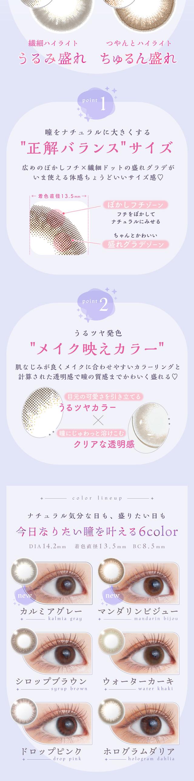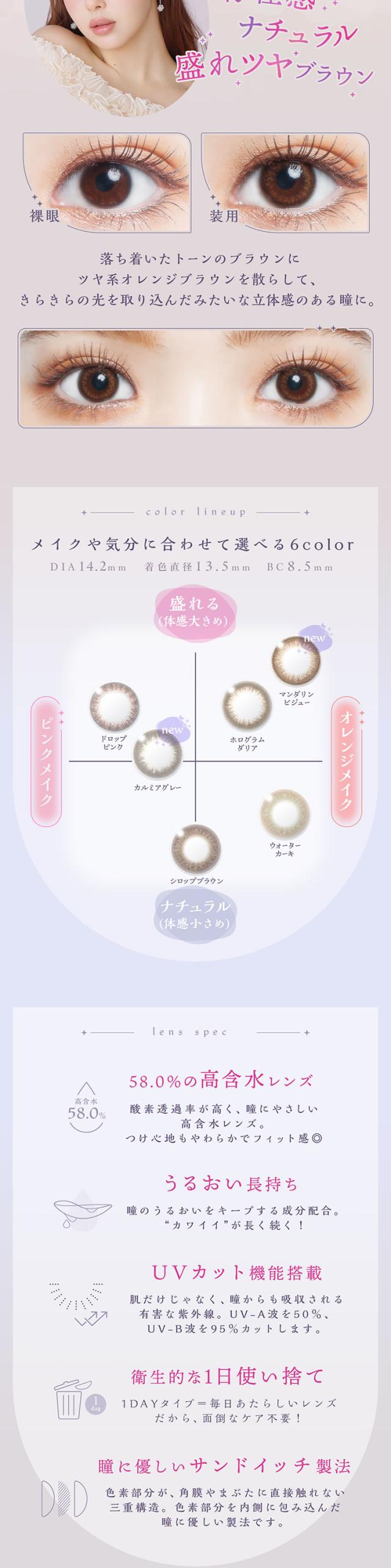 ■カラー:シロップブラウン、ウォーターカーキ、ドロップピンク、ホログラムダリア、カルミアグレー、マンダリンビジュー