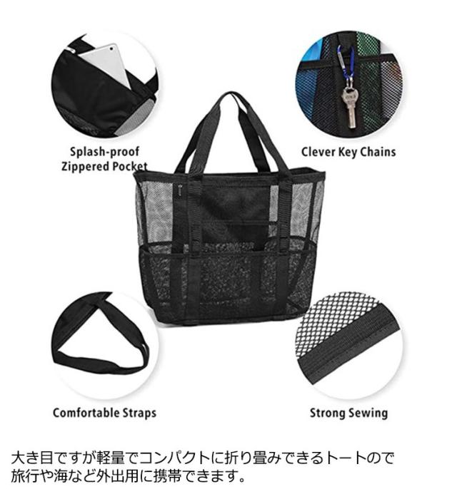 | 大容量のメッシュトートバッグです。砂場や海水浴、プール、温泉、ダイビングやお買い物、玩具入れに大活躍!通勤通学、ジム、旅行など荷物が多い時に便利なバッグです。 多ポケット、内部にファスナーポケットがあります。表にはカラビナ・フックが付けられます。持ちやすいハンドルです。肩掛けもできる大型トートバッグです。 大き目ですが軽量でコンパクトに折り畳みできるトートので旅行や海など外出用に携帯できます。 網目なので砂や水が底に溜まりません。内部のビニールポケットはファスナー付なので小物を収納できます。※生活防水仕様です、完全防水ではありません※ 丈夫なポリエステルオックスフォード生地です。メッシュ素材のトートは水に濡れても乾きやすいです。ご家庭で洗えます。 | |