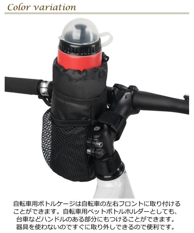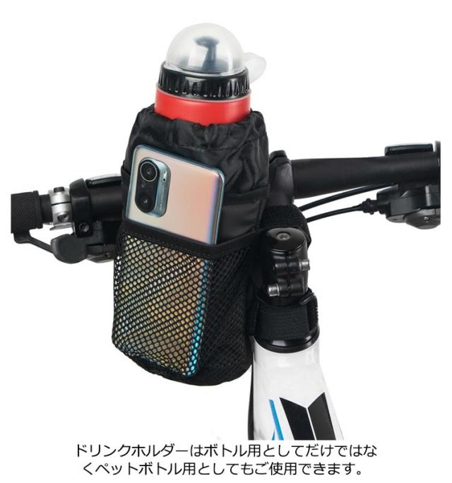 | ハンドルバーにつける自転車用ドリンクホルダー です。水筒、ボトル、ペットボトルに対応しています。口は巾着型で、小型のハンドルバーバッグにもなります。 内部にアルミ素材を採用。ボトルやペットボトルの保温保冷効果があります。 自転車用ボトルケージは自転車の左右フロントに取り付けることができます。自転車用ペットボトルホルダーとしても、台車などハンドルのある部分にもつけることができます。器具を使わないのですぐに取り外しできるので便利です。 ドリンクホルダーはボトル用としてだけではなくペットボトル用としてもご使用できます。 | |