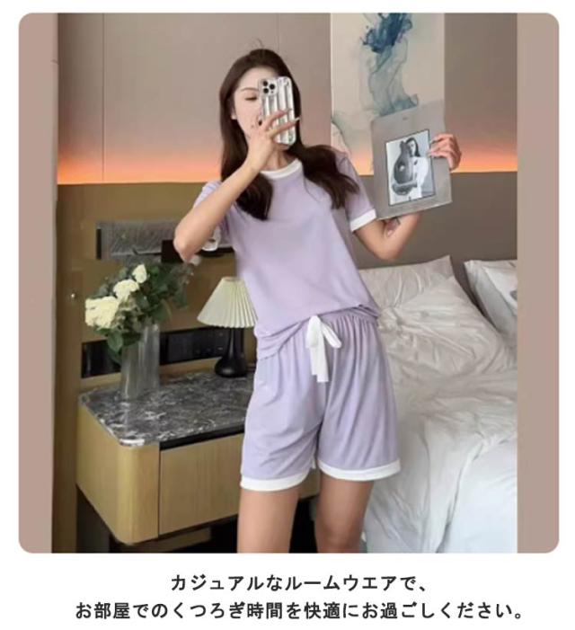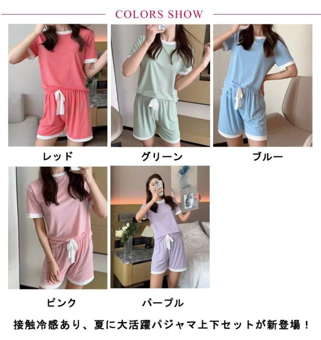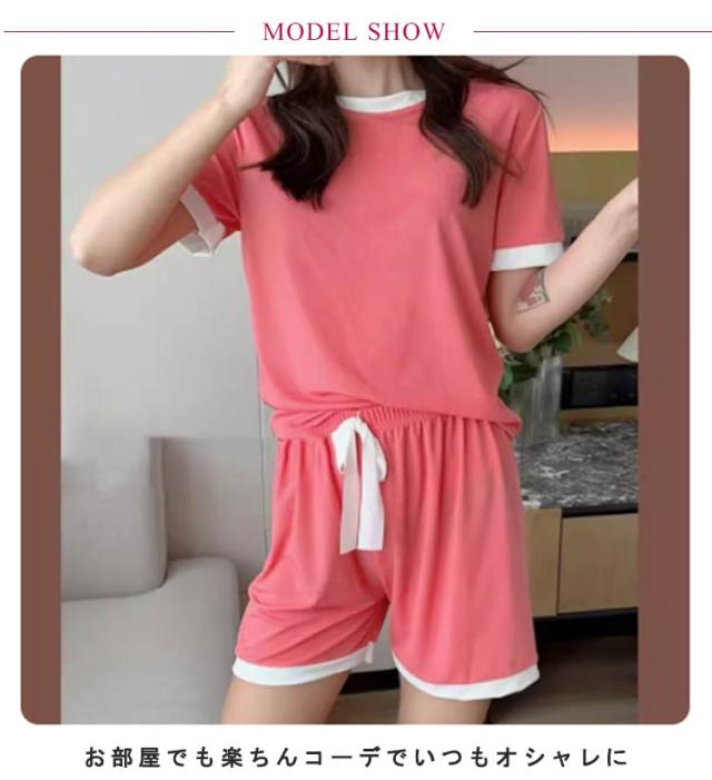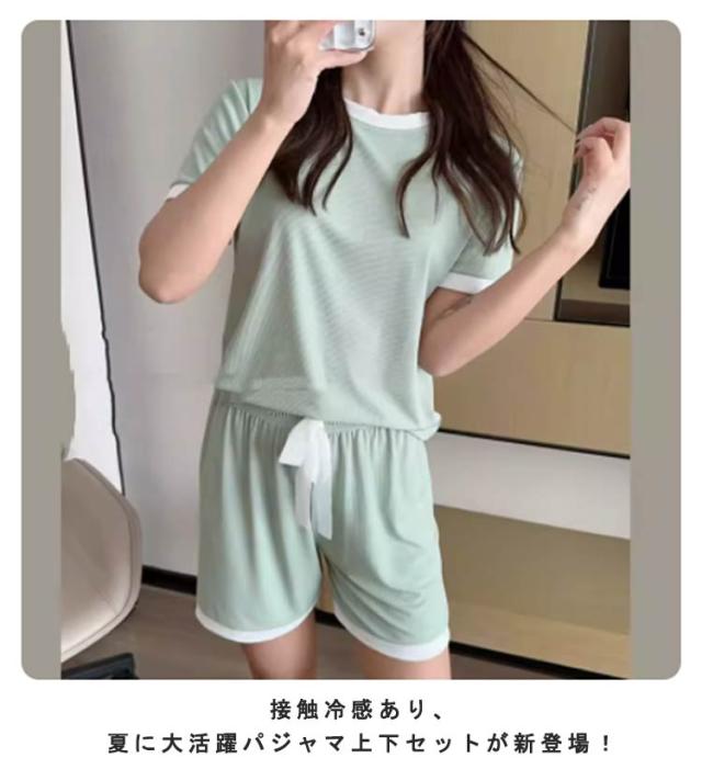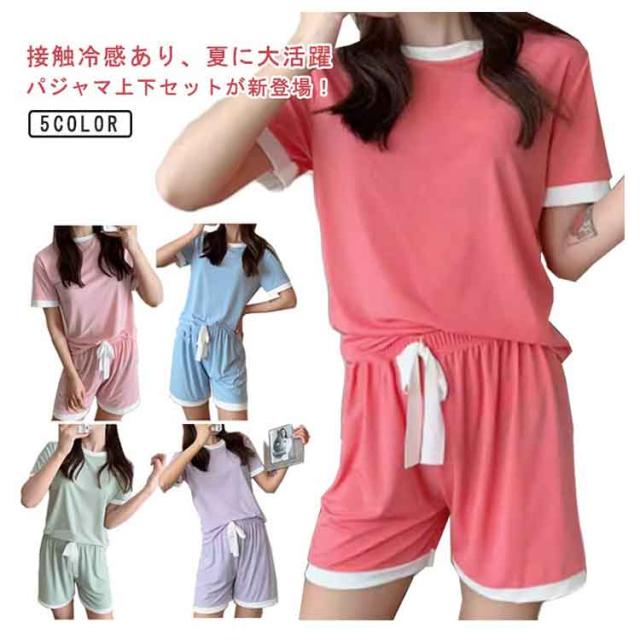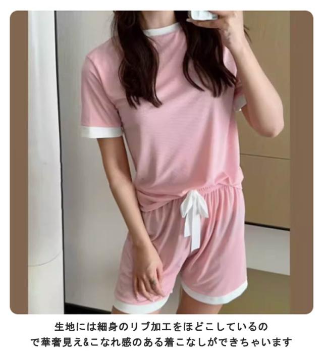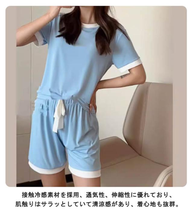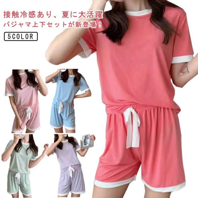 夏 セットアップ 配色デザイン パジャマ tシャツ 涼しい ルームウェア 接触冷感 部屋着 寝間着 半袖tシャツ 寝巻き リブ 半袖 接触冷感 トップス ワンマイルウェア ショートパンツ 2点セット ラウンドネック 丸首 上下セット 無地 可愛い ひんやり