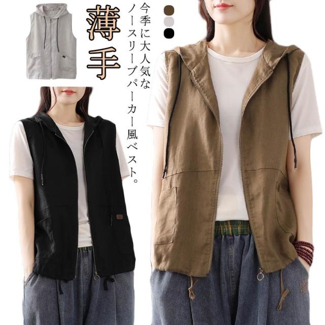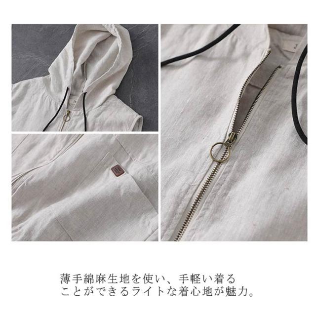 綿麻 リネンベスト フード付き レディース リネンベスト ジップアップ パーカー ベスト ジレ 薄手 フード付きベスト 麻 春 夏 秋