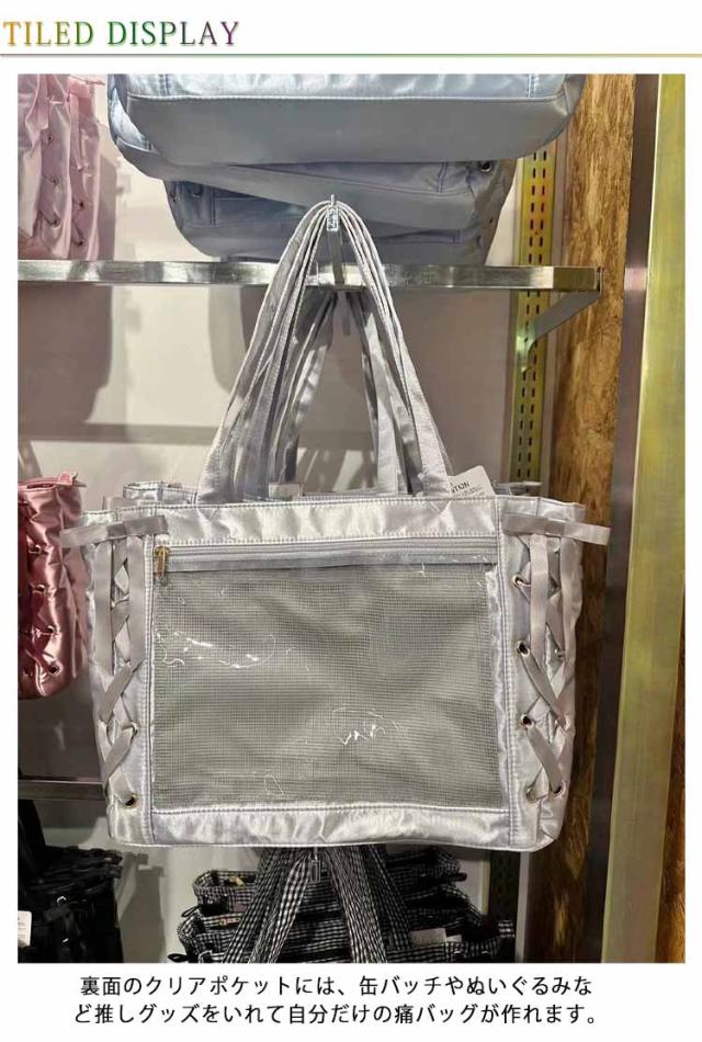 | レースアップデザインの新作痛バッグがバージョンアップして新登場!2024 裏面のクリアポケットには、缶バッチやぬいぐるみなど推しグッズをいれて自分だけの痛バッグが作れます。 缶バッチのピンにも優しい、バッグと同色の柔らかい専用メッシュシート付き。 内側にはポケットが2つあるため、なくしやすいリップなどの小物収納におすすめ。 ヲタ活の必需品がしっかり収納できる大きめのサイズ感。ファイルやうちわもしっかり入ります。 派手すぎないカラーで、とっておきの参戦服にも馴染みます。 | |