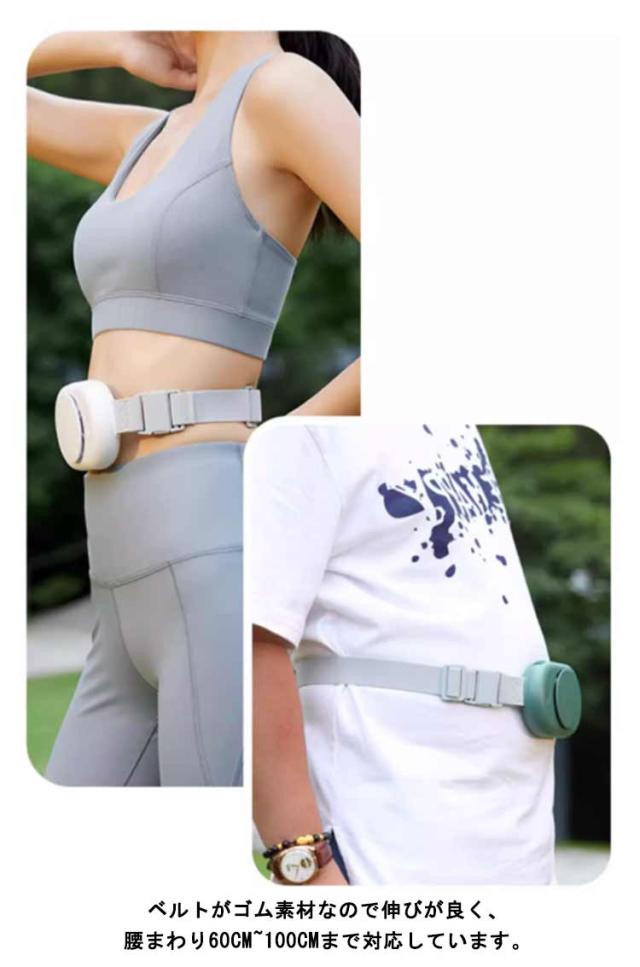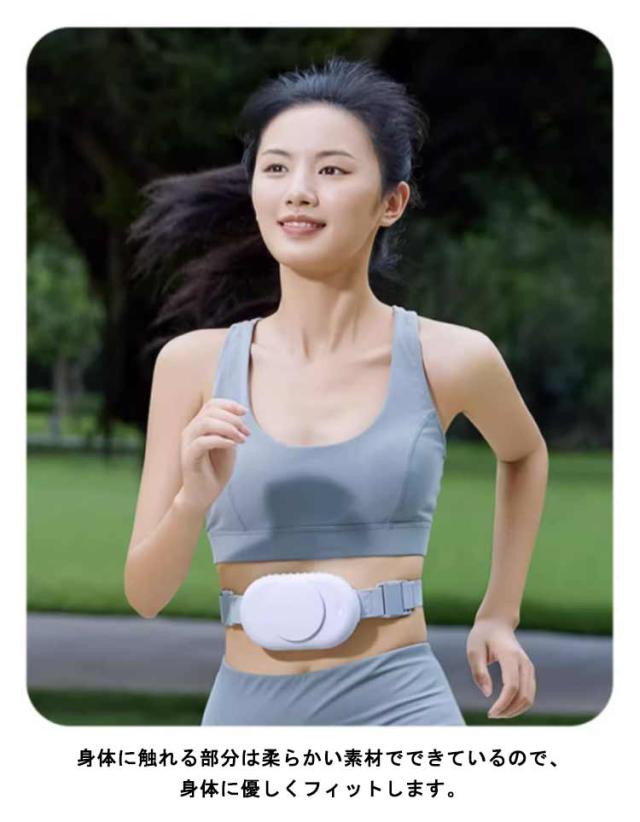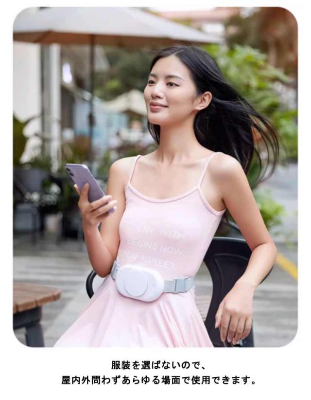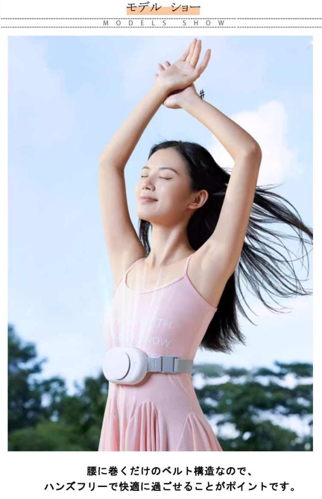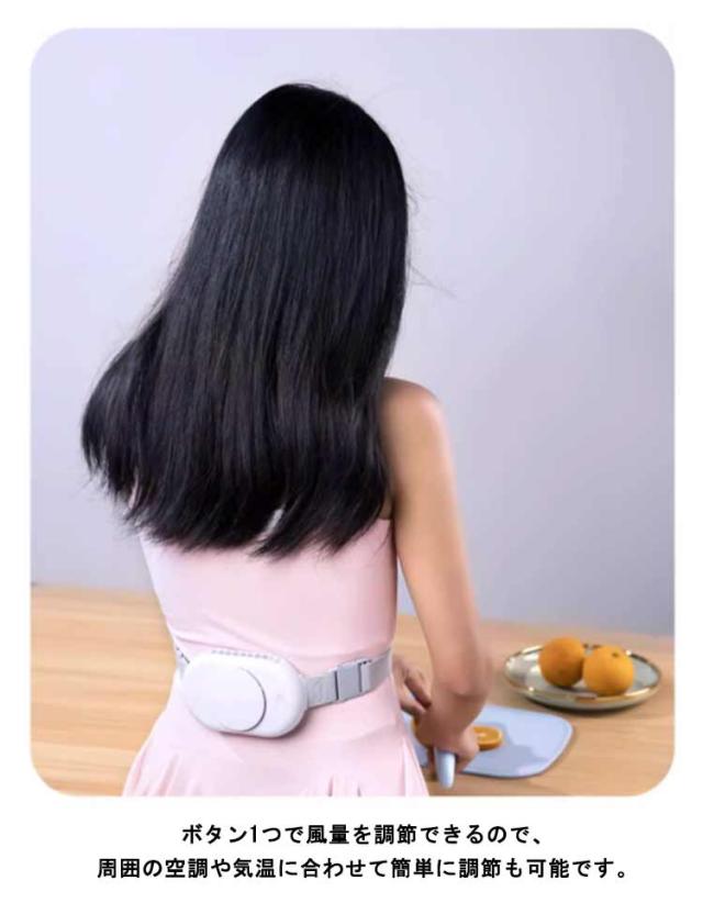 | 腰に巻くだけのベルト構造なので、ハンズフリーで快適に過ごせることがポイントです。 ベルトがゴム素材なので伸びが良く、腰まわり60cm~100cmまで対応しています。 身体に触れる部分は柔らかい素材でできているので、身体に優しくフィットします。 服装を選ばないので、屋内外問わずあらゆる場面で使用できます。 ボタン1つで風量を調節できるので、周囲の空調や気温に合わせて簡単に調節も可能です。 | |