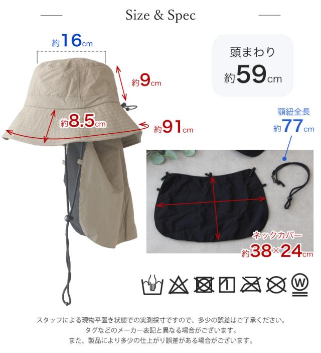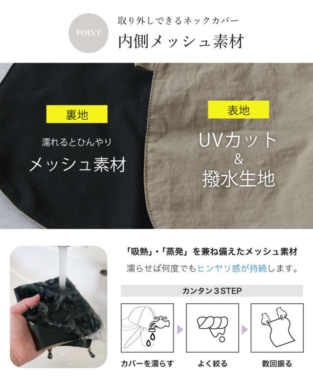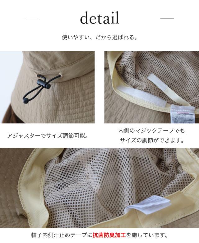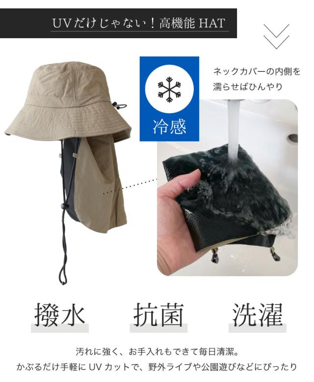 UVだけじゃない!使いやすいベーシックカラー展開の撥水冷感ネックカバー付きバケットハット。 取り外し可能なネックカバーがついており、ネックカバーは2重仕様で内側のメッシュ生地を濡らすとひんやり!熱がこもりやすい首裏が快適に。抗菌防臭加工もあり、野外ライブや公園遊びなど春・夏のおでかけにぴったりです。