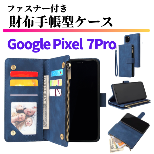Google Pixel 7 Pro ケース 手帳型 お財布 レザー カードケース ジップファスナー収納付 おしゃれ スマホケース 手帳 Pixel7Pro ブルー ピクセル7プロ