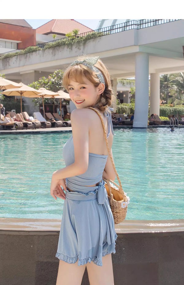 タンキニ水着 服みたいな 水着 3点セット 肩出し セクシー ワイヤーなし パッド付 レディース 着?せ シンプル 写真映え 撮影用 海 夏 サマー プール リゾート 大人可愛い 旅行 温泉 女性用 ジュニア 学生 女の子 ブルー