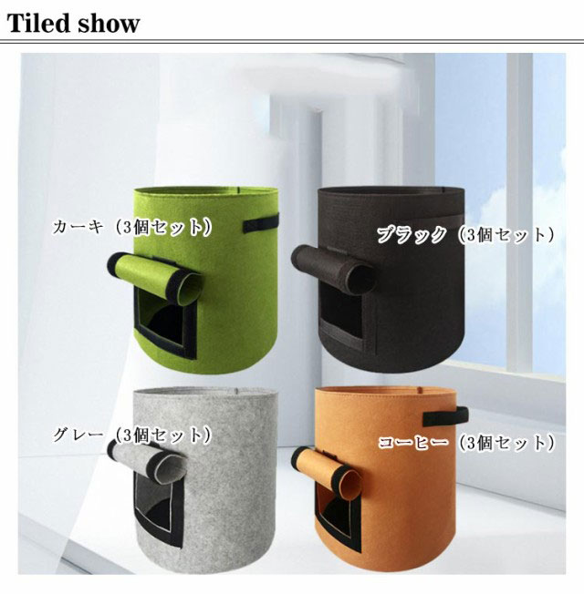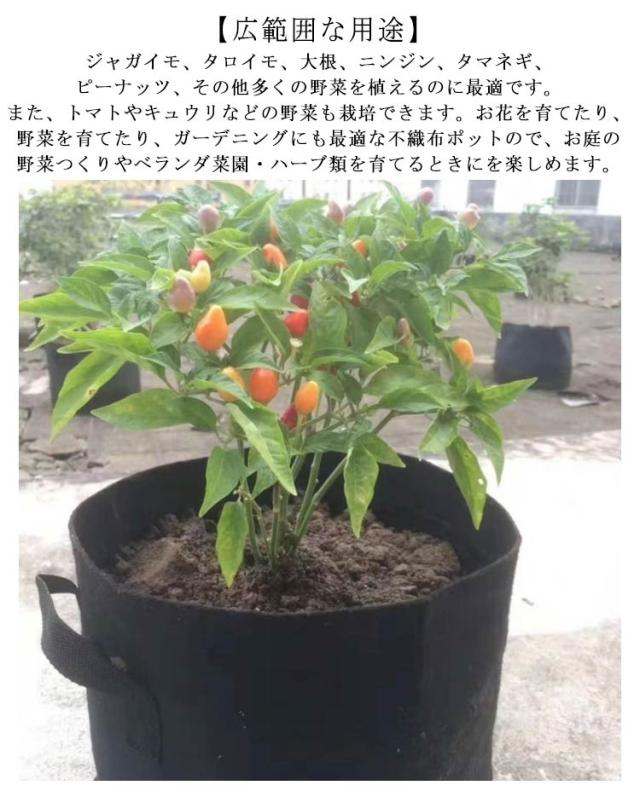 | 【高品質の材質】環境に優しい不織布。厚手の不織布と裏地から作られて、通気性、透水性、放熱性に優れているため植物の発育が良いと評価され、育苗、植栽用の鉢として広く使われています。高温時は熱で根が傷むこともありませんが、根の発育を促進し、根腐れが起こりにくいです。また丈夫さがよくて長持ちができ、何回を繰り返して利用できます。 【サイド開口設計】可視ウィンドウから簡単に収穫できます。これを使用して、野菜が熟しているかどうかを判断し、粘土土を掘ったり、苗を傷つけたりすることなく、直接収穫できます。 【室内栽培可能】軽量で持ち手が付いてるので移動が楽です。室内栽培可能,透水性と保水性がありますので底面に石を敷く必要なし。不織布が土の流出を防ぎ鉢底石いらずのポットなので、ベランダでの利用にも便利です。 【取っ手が付い】フェルトプランターは丈夫な取っ手が付いてあり、移動するときとても便利です。 【広範囲な用途】ジャガイモ、タロイモ、大根、ニンジン、タマネギ、ピーナッツ、その他多くの野菜を植えるのに最適です。また、トマトやキュウリなどの野菜も栽培できます。お花を育てたり、野菜を育てたり、ガーデニングにも最適な不織布ポットので、お庭の野菜つくりやベランダ菜園・ハーブ類を育てるときにを楽しめます。 | |
