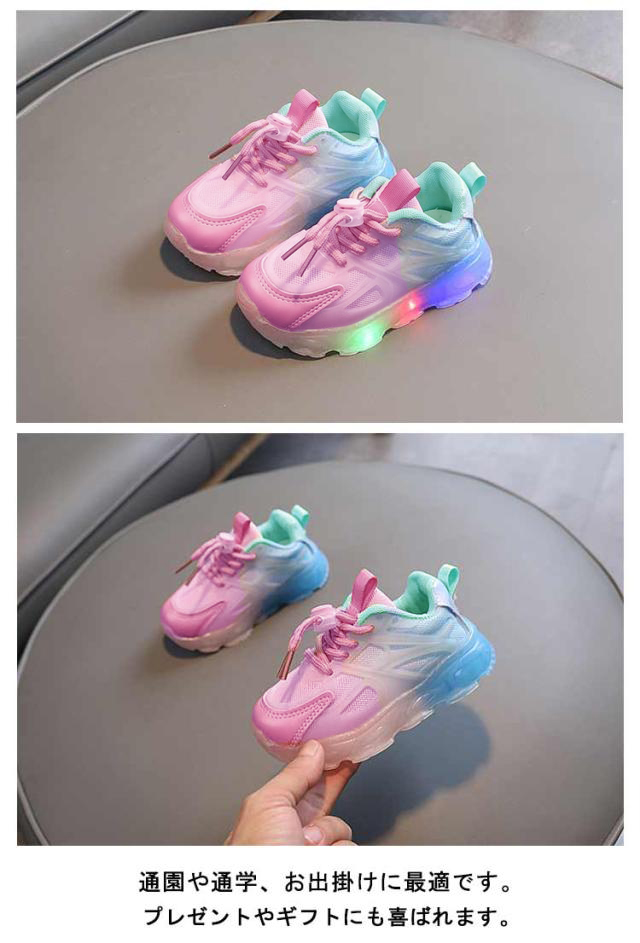 | 子供用 光る靴 クラディーションカラーでとっても可愛い 15.5〜20cm 歩く度に側面が光るので夜道でも分かりやすい! 通園や通学、お出掛けに最適です。 プレゼントやギフトにも喜ばれます。 | |