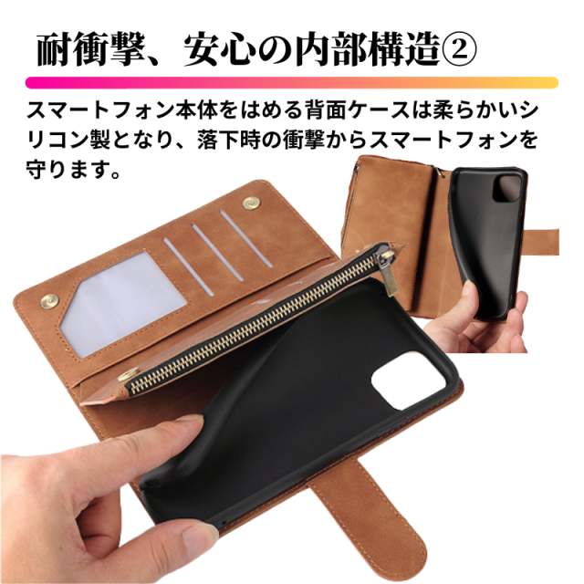 外部は上質なPUレザーを採用し、 ふわふわな質感で、手にしっかりフィット。 内部は柔らかいTPU材質を採用し、本体への衝撃を緩和させる仕様で、キズや衝撃から大切な携帯をしっかり保護します