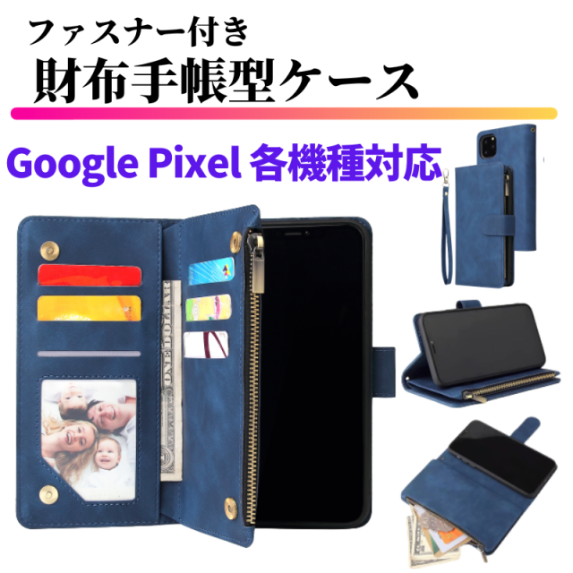 Google Pixel ケース 手帳型 レザー お財布 シンプル カードケース 軽量 カード収納 スタンド ストラップ付 耐衝撃 ジップ付 手帳 財布 スマホケース Pixelケース カバー Pixel10 9a 8 8a 8Pro 7a 7 7Pro 6a 6 6Pro 5a 5G 4 4XL 4a 4a5G 3a 3aXLグーグル ピクセル ブルー