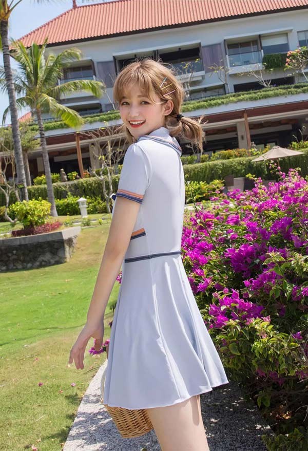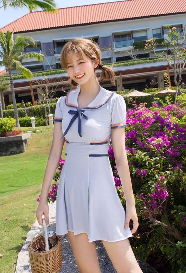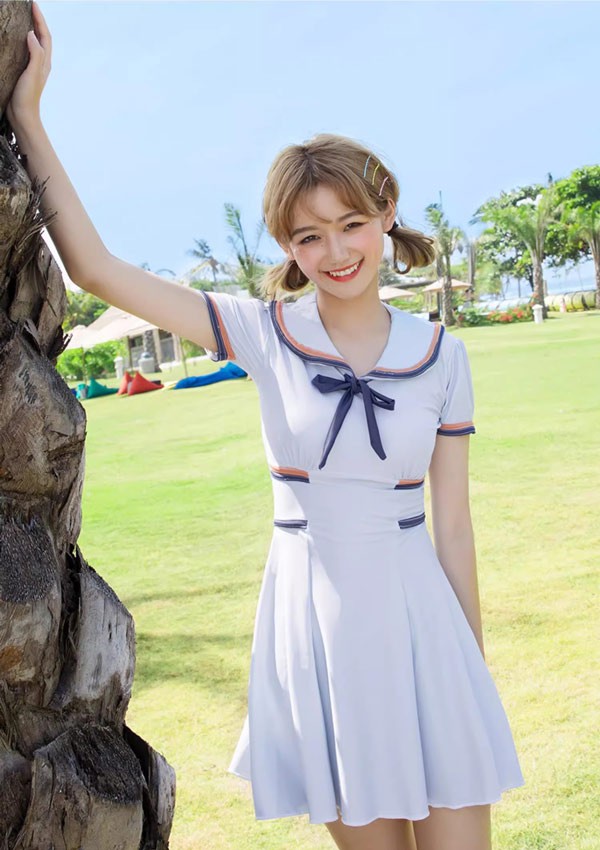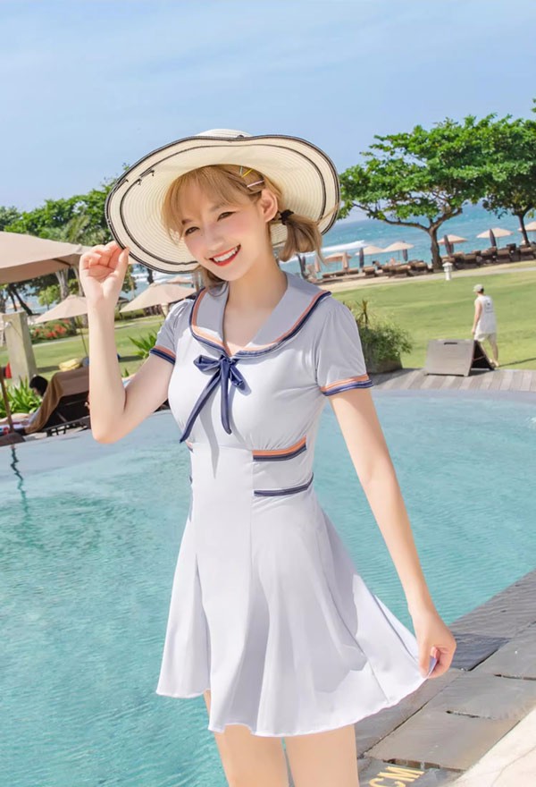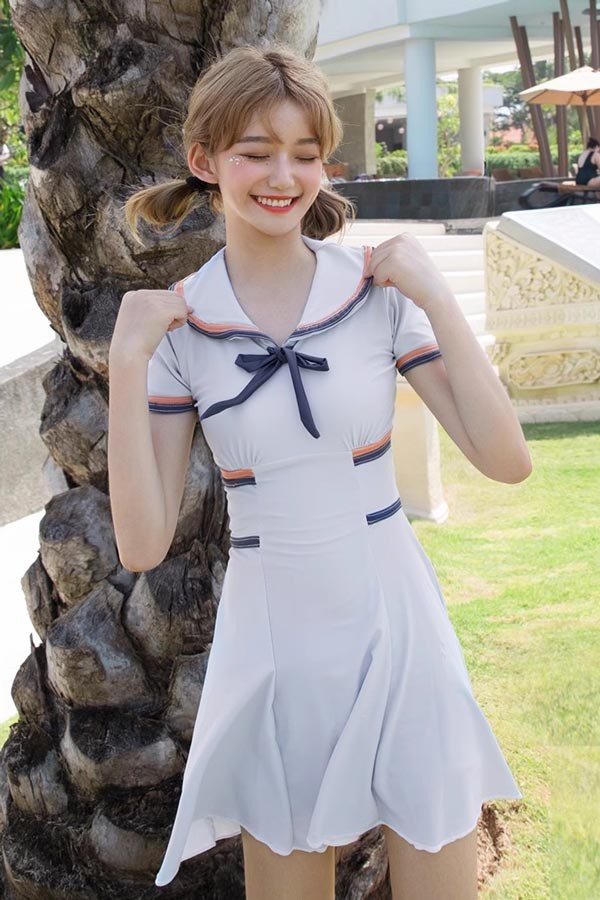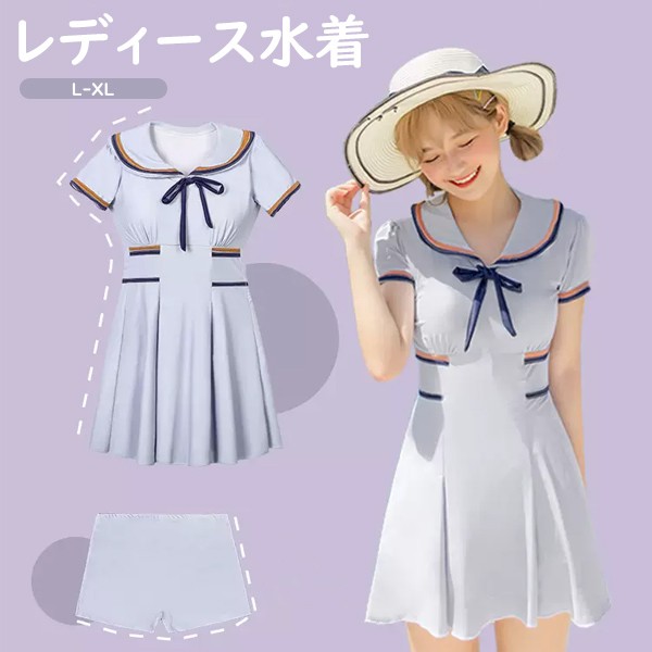 ワンピース水着 服みたいな 水着 2点セット セーラー 制服風 半袖 リボン ワイヤーなし パッド付 レディース 着?せ 服みたいな シンプル セクシー 写真映え 撮影用 海 夏 サマー プール リゾート かわいい オシャレ 旅行 温泉 大人 女性用 ジュニア 学生 女の子 グレー