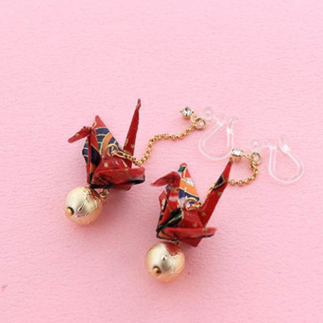 赤/折り鶴&パール揺れる樹脂イヤリング / サン宝石