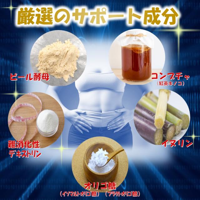 「ビール酵母」「コンブチャ」「イヌリン」「イソマルトオリゴ糖」「フラクトオリゴ糖」「難消化性デキストリン」