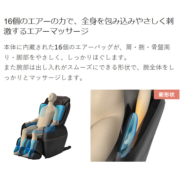 本体に内蔵された16個のエアーバッグが、肩・腕・骨盤周り・脚部をやさしく、しっかりほぐします。