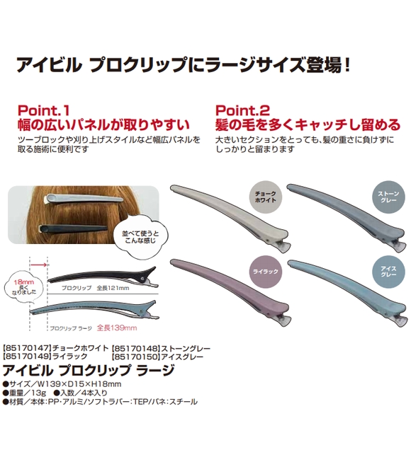 | 商品名 | アイビル プロクリップ ラージ チョークホワイト JAN:4989550232283 ストーングレー JAN:4989550232290 ライラック JAN:4989550232306 アイスグレー JAN:4989550232320 | ||