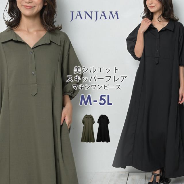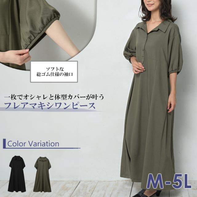 送料無料※沖縄/北海道対象外 大きいサイズ レディース フレアワンピース ロング丈 5分袖 スキッパー襟 美シルエット M/LL/3L/4L/5L ゆったりサイズ ぽっちゃり女子 プラスサイズ