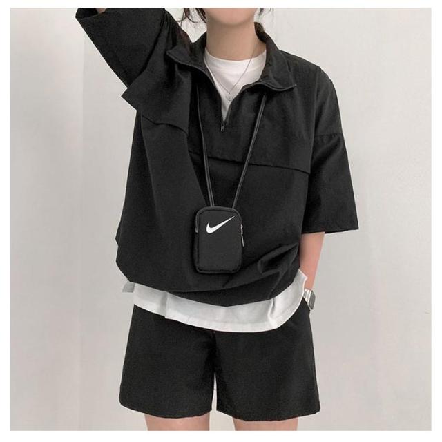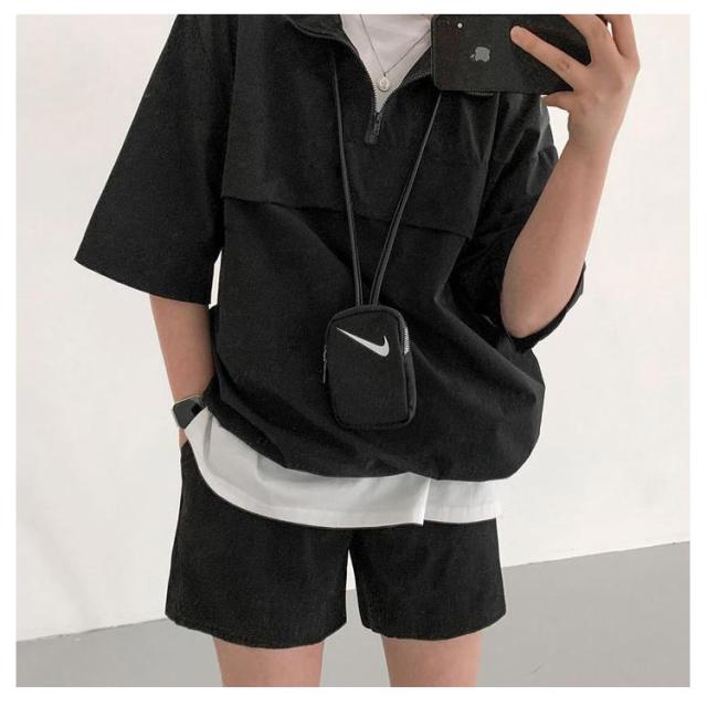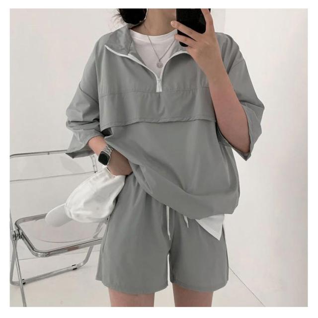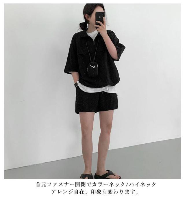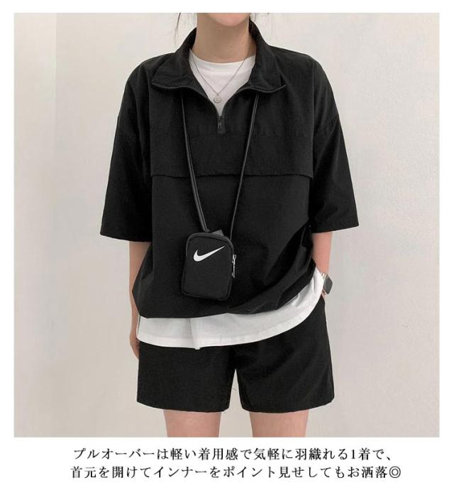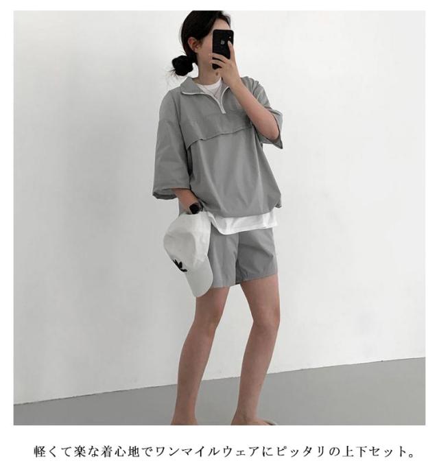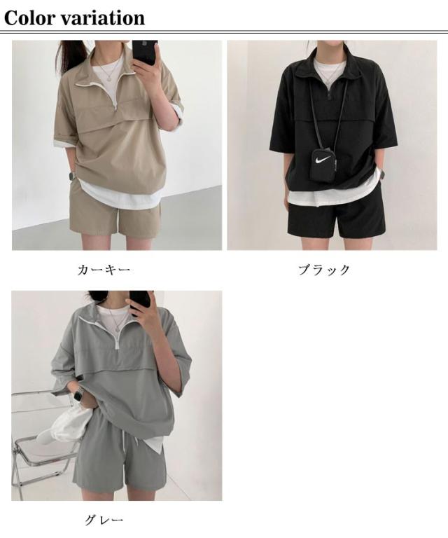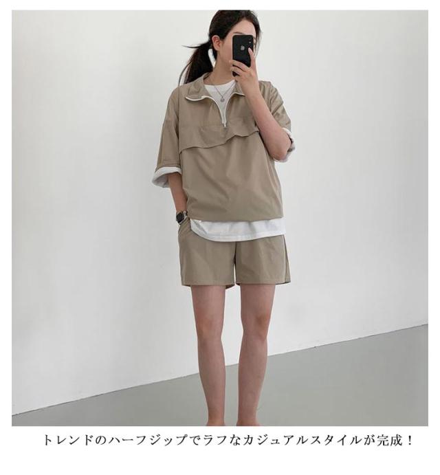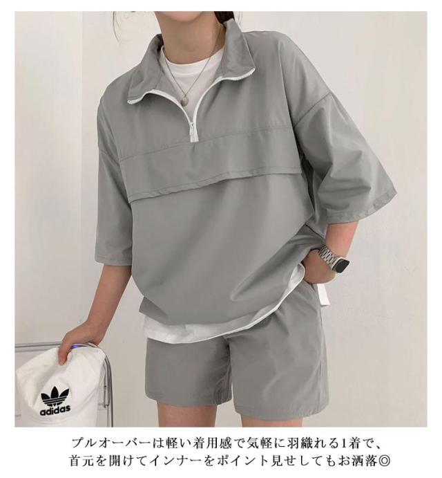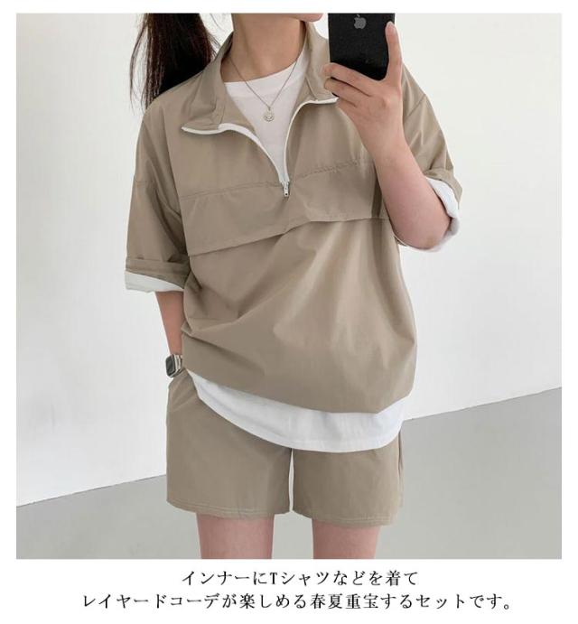 | こなれ感の出るハーフジッププルオーバーセットアップ♪ 軽くて楽な着心地でワンマイルウェアにピッタリの上下セット。 プルオーバーは軽い着用感で気軽に羽織れる1着で、首元を開けてインナーをポイント見せしてもお洒落◎ 首元ファスナー開閉でカラーネック/ハイネックアレンジ自在、印象も変わります。 トレンドのハーフジップでラフなカジュアルスタイルが完成!インナーにTシャツなどを着てレイヤードコーデが楽しめる春夏重宝するセットです。 (白Tシャツは付属しません、ご了承ください) | |