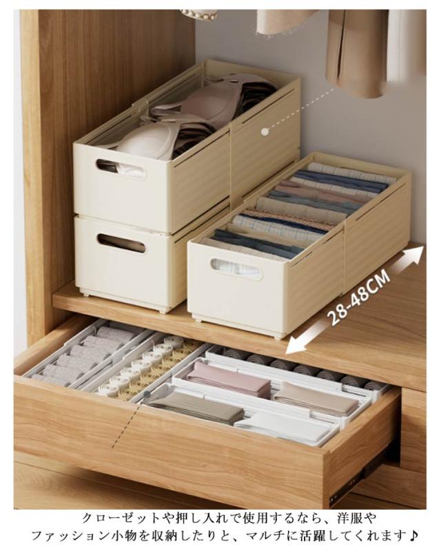 | ・収納する物によって奥行を変えられて便利♪ ・収納スペースや引き出しに合わせて、ぴったりと幅を合わせることが可能です! ・キッチンで使用するなら、食器や食品のストックなどを収納したり… ・クローゼットや押し入れで使用するなら、洋服やファッション小物を収納したりと、マルチに活躍してくれます♪ ・積み重ねができます。 ・折りたたみ式なので組み立て方も簡単です。 ・軽量でコンパクトに収納できます。 | |