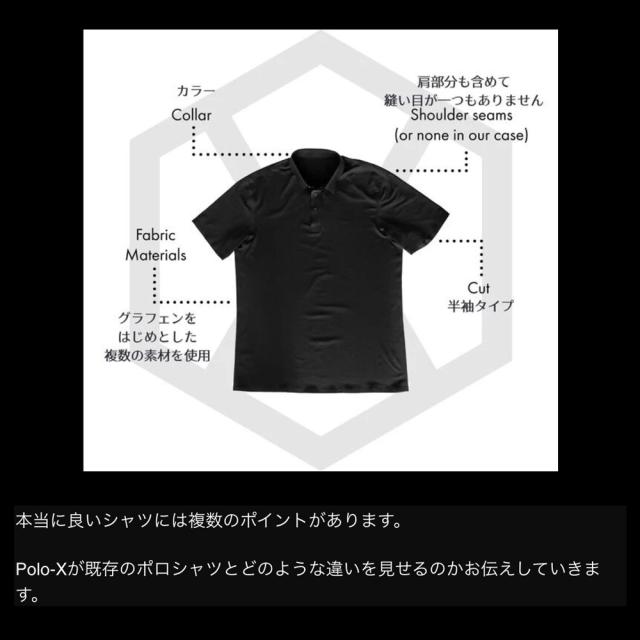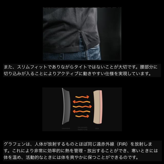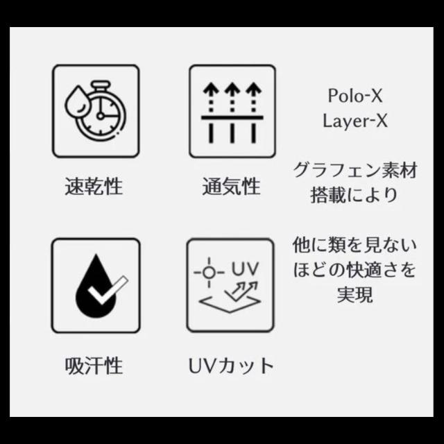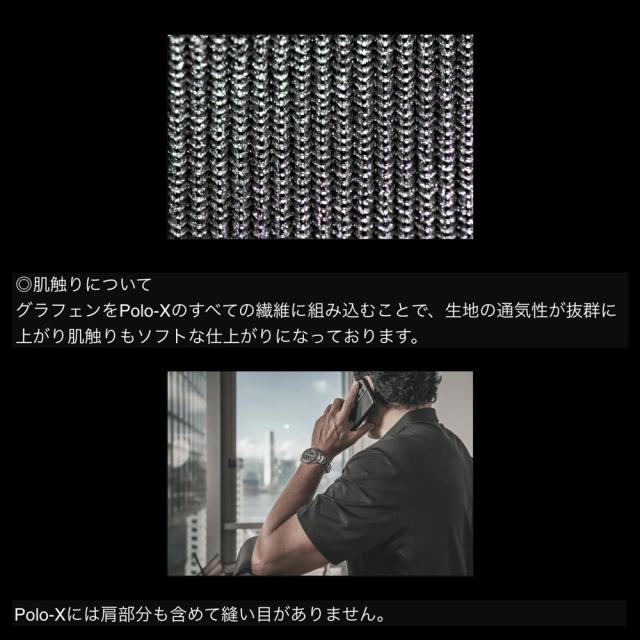 グラフェンをPolo-Xのすべての繊維に組み込むことで、生地の通気性が抜群に上がり肌触りもソフトな仕上がりになっております。Polo-Xには肩部分も含めて縫い目がありません。また、スリムフィットでありながらタイトではないことが大切です。腰部分に切り込みが入ることによりアクティブに動きやすい仕様を実現しています。