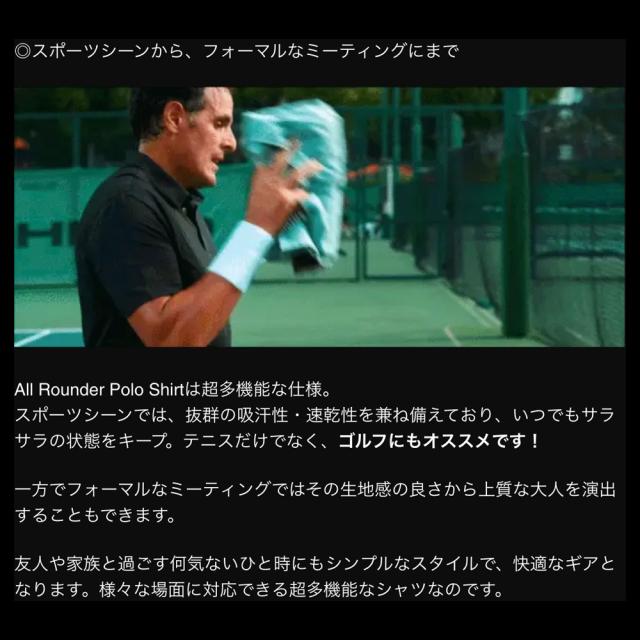 All Rounder Polo Shirtは超多機能な仕様。スポーツシーンでは、抜群の吸汗性・速乾性を兼ね備えており、いつでもサラサラの状態をキープ。テニスだけでなく、ゴルフにもオススメです!一方でフォーマルなミーティングではその生地感の良さから上質な大人を演出することもできます。友人や家族と過ごす何気ないひと時にもシンプルなスタイルで、快適なギアとなります。様々な場面に対応できる超多機能なシャツなのです。1着で多様な状況に対応します。