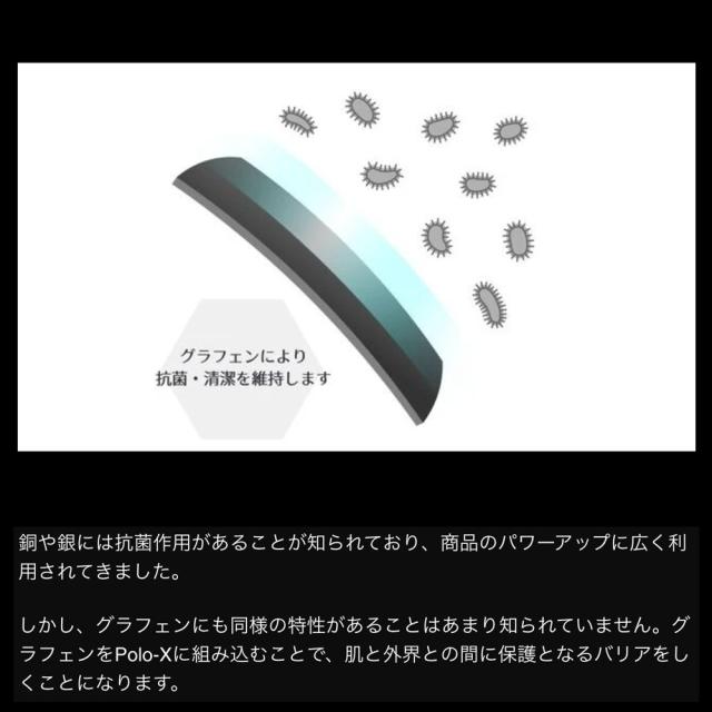 銅や銀には抗菌作用があることが知られており、商品のパワーアップに広く利用されてきました。しかし、グラフェンにも同様の特性があることはあまり知られていません。グラフェンをPolo-Xに組み込むことで、肌と外界との間に保護となるバリアをしくことになります。