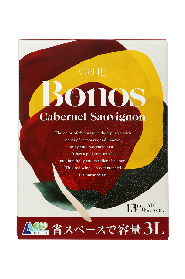 | ワインの原産国・チリの母国語であるスペイン語で『ボノス』は"絆(きずな)"を意味します。 チリの大地の恵みであるワインを日本の皆さまへ、「絆」を大切にしたい想いを込めたワインです。 コストパフォーマンスに優れたワインを製造する南アメリカ・チリ産の代表的な赤ぶどう品種であるカベルネソーヴィニヨンの中から、優れた品質のワインを選び、味わい・品質管理には細心の注意を払い、日本の工場において3Lサイズに詰めました。 |