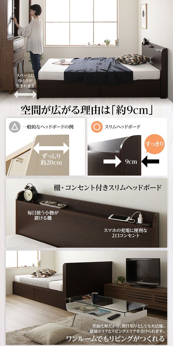 ・棚・コンセント付きスリムヘッドボード