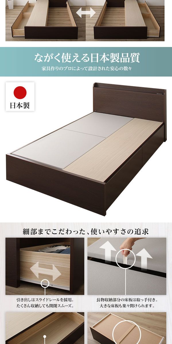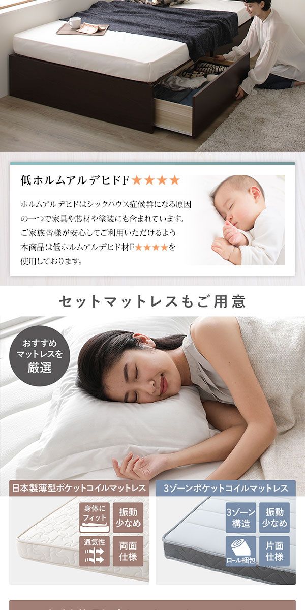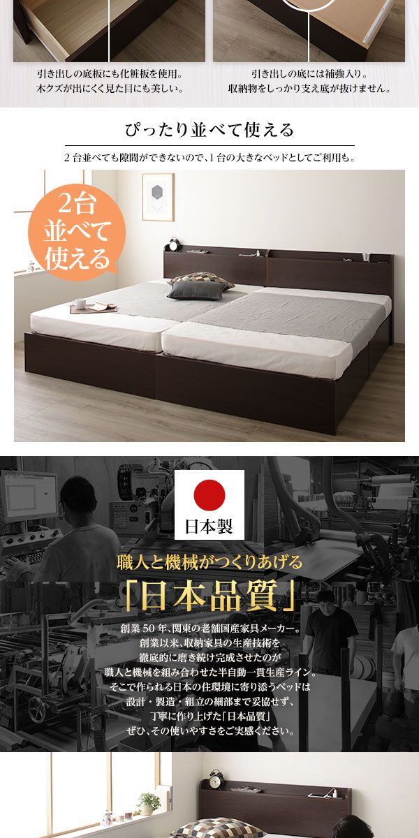 〔お客様組み立て〕薄型宮付き 頑丈ボックス収納 ベッド シングル ダークブラウン 3ゾーンポケットコイルマットレス付き 引き出し2杯 日本製 【北海道・沖縄・離島配送不可】