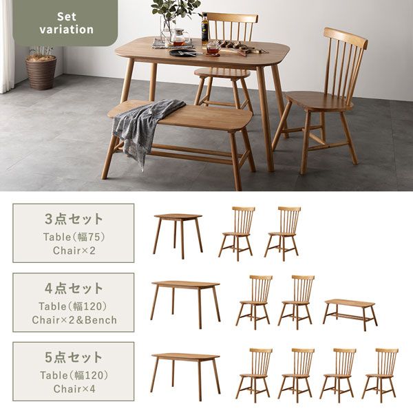 ●本商品は仕入元より配送となるため、北海道・沖縄・離島への配送はできません。 ■商品サイズ(約) テーブル幅75cm:幅75×奥行75×高さ70cm テーブル幅120cm:幅120×奥行75×高さ70cm テーブル直径90cm:幅90×奥行90×高さ70cm チェア:幅50×奥行55×高さ85(座面高42cm) ※1脚あたり ベンチ:幅90×奥行38×高さ40cm ■材質 主材:天然木 天板(テーブル):天然木化粧繊維板(ナチュラル/ブラウン)、繊維板(ホワイト) ■静止耐荷重(約) テーブル(幅75cm・幅120cm・直径90cm共通):20kg チェア:80kg ※1脚あたり ベンチ:80kg ■生産国 マレーシア ■備考 ・組み立て品(脚の取り付け) ※テーブル、チェア、ベンチ全て ・テーブルセットには、傷つき防止のフリーカットのフェルト(グレー)付き 【ご注意事項】 ・掲載写真は...