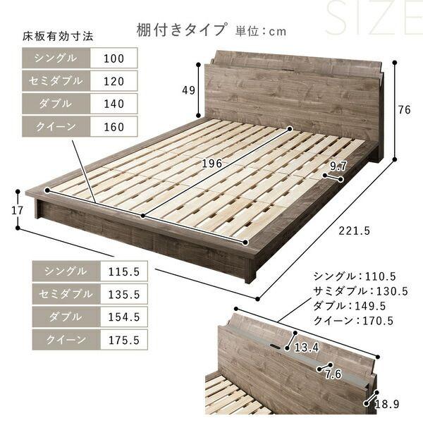 ●本商品は仕入元より配送となるため、北海道・沖縄・離島への配送はできません。 【ベッドフレーム本体】 ■サイズ(約) ・パネルタイプ シングル:幅115.5×奥行213×高さ66cm セミダブル:幅135.5×奥行213×高さ66cm ダブル:幅154.5×奥行213×高さ66cm クイーン:幅175.5×奥行213×高さ66cm 床面までの高さ(全サイズ共通):17cm ・棚付きタイプ シングル:幅115.5×奥行221.5×高さ76cm セミダブル:幅135.5×奥行221.5×高さ76cm ダブル:幅154.5×奥行221.5×高さ76cm クイーン:幅175.5×奥行221.5×高さ76cm 床面までの高さ(全サイズ共通):17cm ■床板有効寸法(約) パネルタイプ・棚付きタイプ共通 シングル:幅100×奥行196cm セミダブル:幅120×奥行196cm ダ...