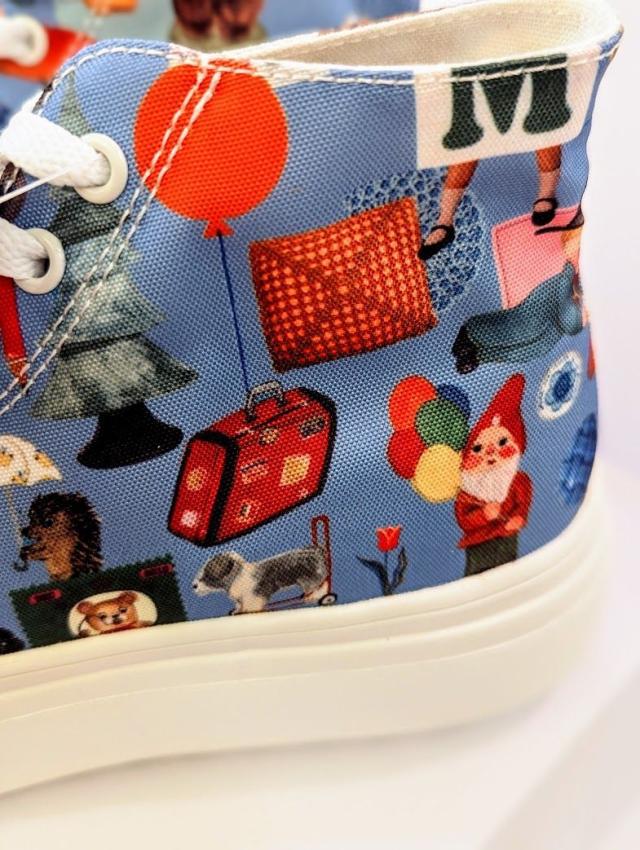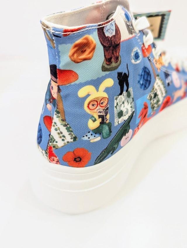 【marini*monteany】の描く人や動物と、小物やボタンなどの写真をコラージュした独特な世界観あふれる柄を厚底ソール