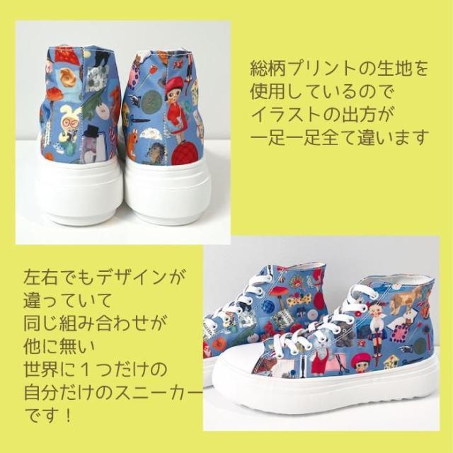 キャラクターの総柄プリントデザインスニーカーですので、左右のデザインが異なり、さまざまな組み合わせになり世界に1つの自分だけのスニーカーです。