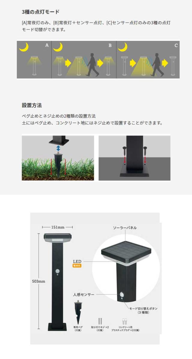 | 点灯切替機能 | ON/OFF・・・モード切替ボタン長押しでON/OFF切替 Aモード・・・常夜灯 Bモード・・・常夜灯+センサー Cモード・・・センサー |