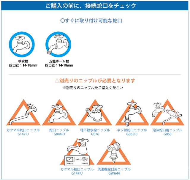 蛇口への接続は工具不要で蛇口にはめてダイヤルを回すだけのワンタッチ接続です。取付けられる蛇口は横水栓(蛇口径14-18mm)、万能ホーム水栓(蛇口径14-18mm)です。